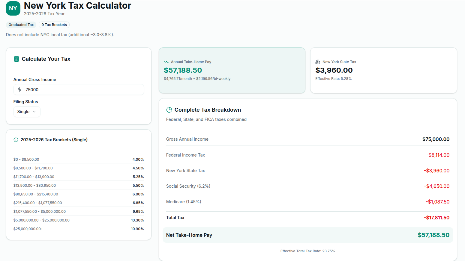 The calculator applies the real New York tax rules — no assumptions are made.